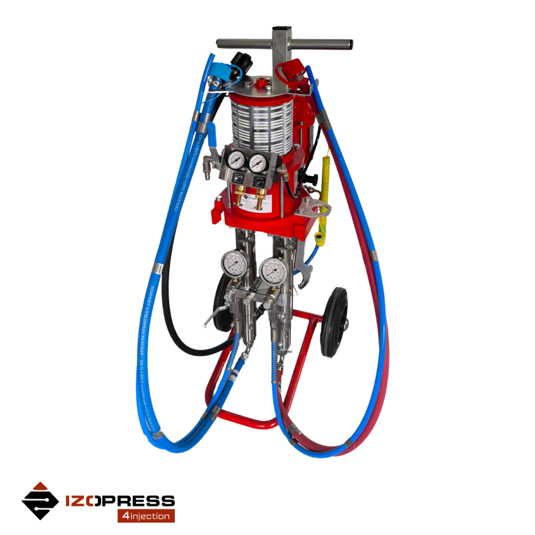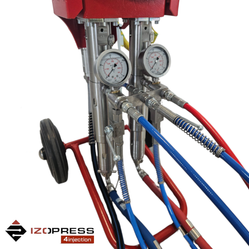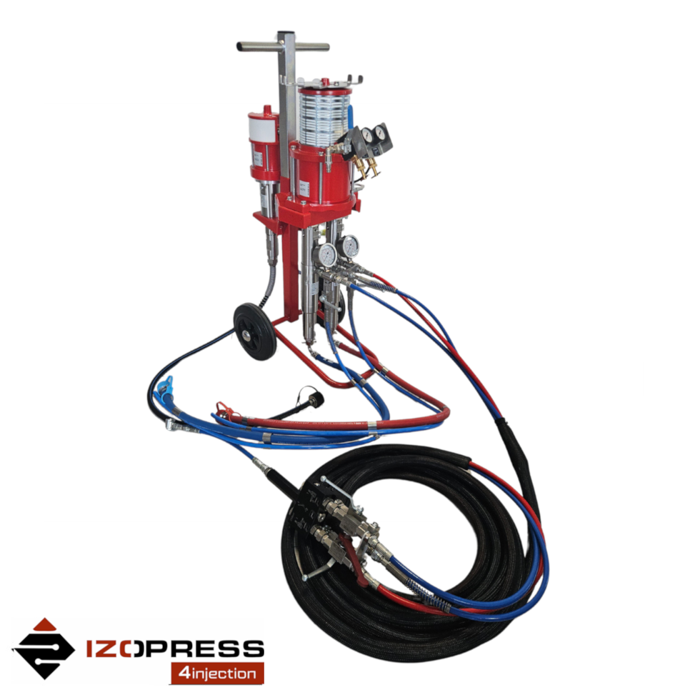 The IZOPRESS Pro 2K-25 is a modern, 2-component, pneumatic piston pump. It is equipped with a mixing head and a set of hoses.